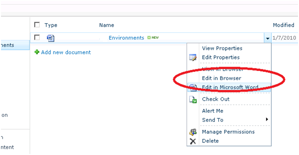 When entering a document library you can now select Edit in Browser (not edit in word).