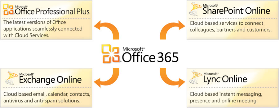 Microsoft Office 365 is the next step in the future of productivity and a brand new way to think about productivity in the Cloud. Microsoft Office 365 brings together Cloud versions of Microsoft’s most trusted next-generation communications and collaboration products with the latest version of Microsoft’s familiar desktop suite; Exchange Online, SharePoint Online and Lync Online.