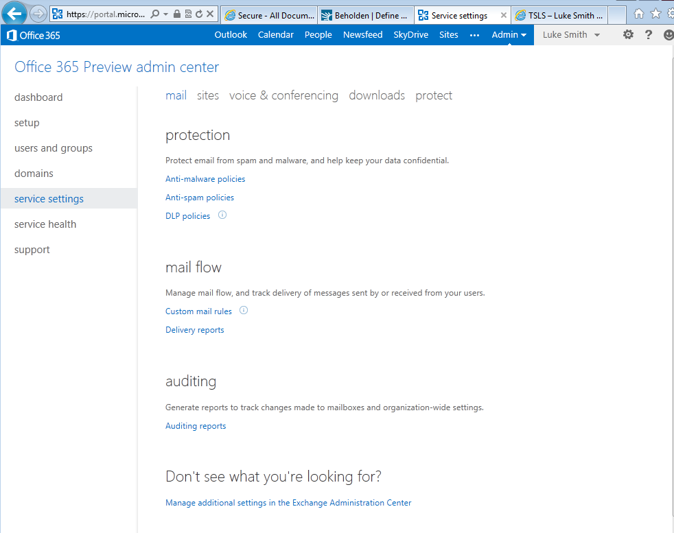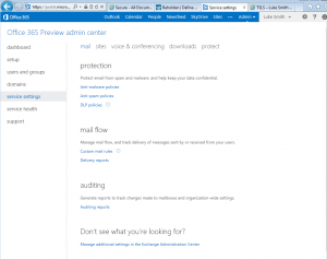 There are additional links for the new features which have been released in Exchange and SharePoint 2013 such as App Store, Records Management, Search, DLP and OWA. FOPE Admin appears to have been removed and routing rules and protection (SPAM) are now included in the Exchange Admin window.
