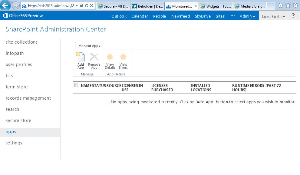Once the app is built select Purchase App – Select App and click Add it (You may get a sign in error, at the point you purchase an app sign in with a LiveID (not the O365 ID))
