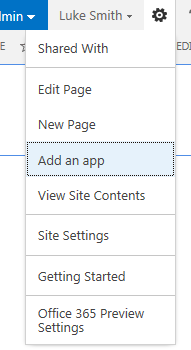 Open up the SharePoint Team site – Select Settings (the cog) – Select Add an App